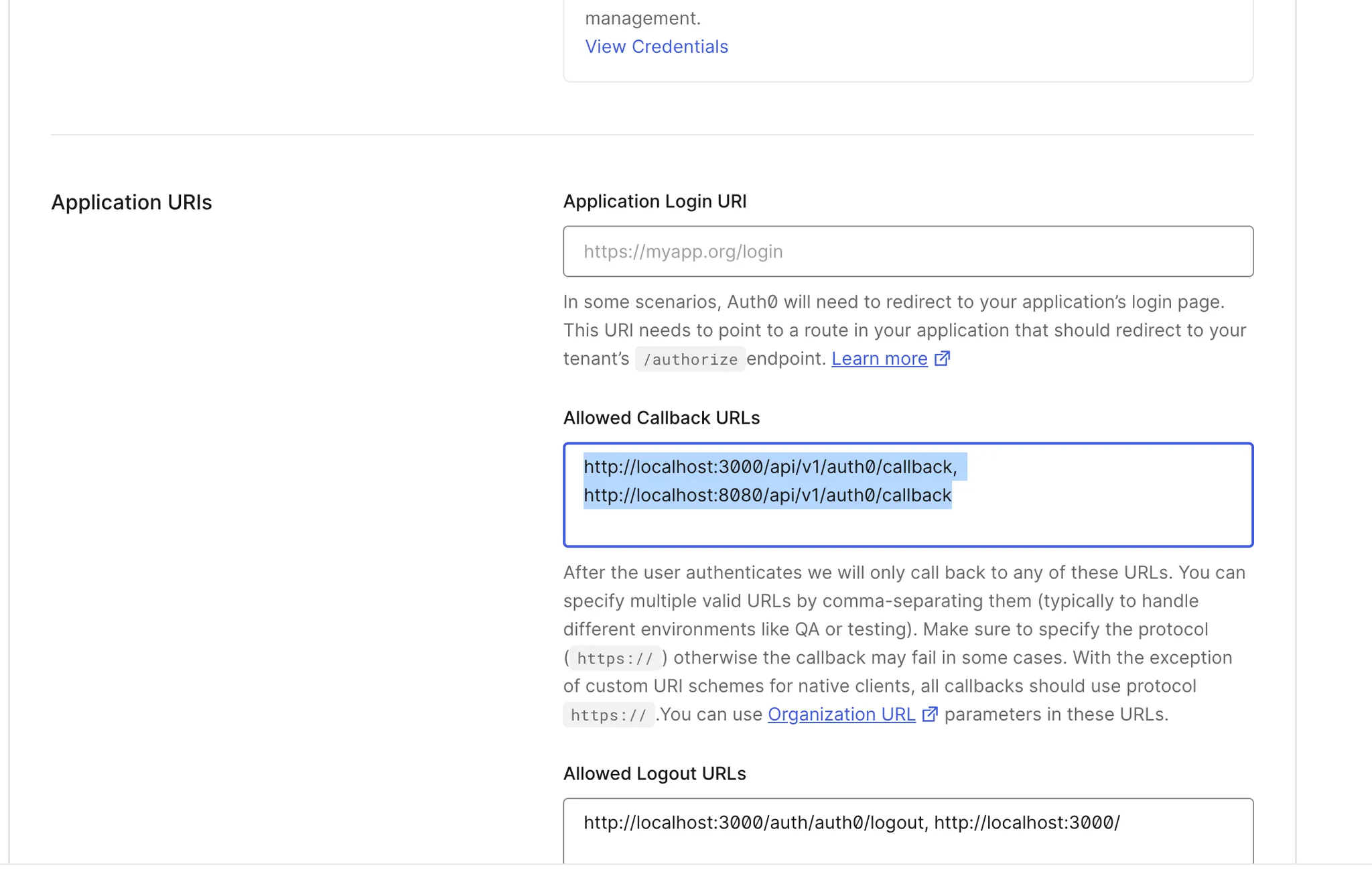 4. Completa los Application URIs. Esto necesitará ser cambiado dependiendo de cómo estés haciendo hosting: `http[s]://[your-flowise-instance.com]/api/v1/auth0/callback`: