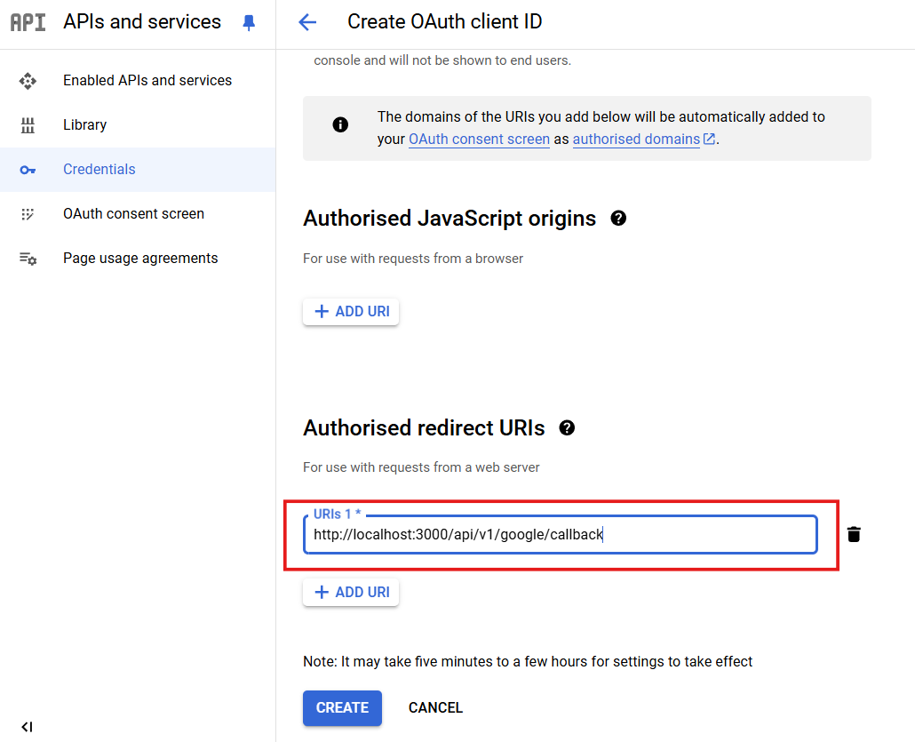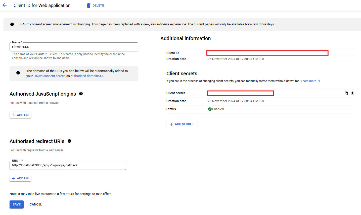 4. Completa los redirect URIs. Esto necesitará ser cambiado dependiendo de cómo estés haciendo hosting: `http[s]://[your-flowise-instance.com]/api/v1/google/callback`: