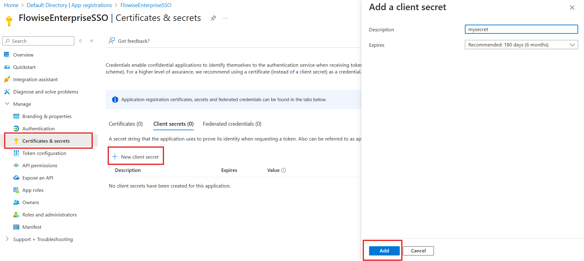 5. En la left side bar, haz click en Certificates & secrets -> New client secret -> Add: