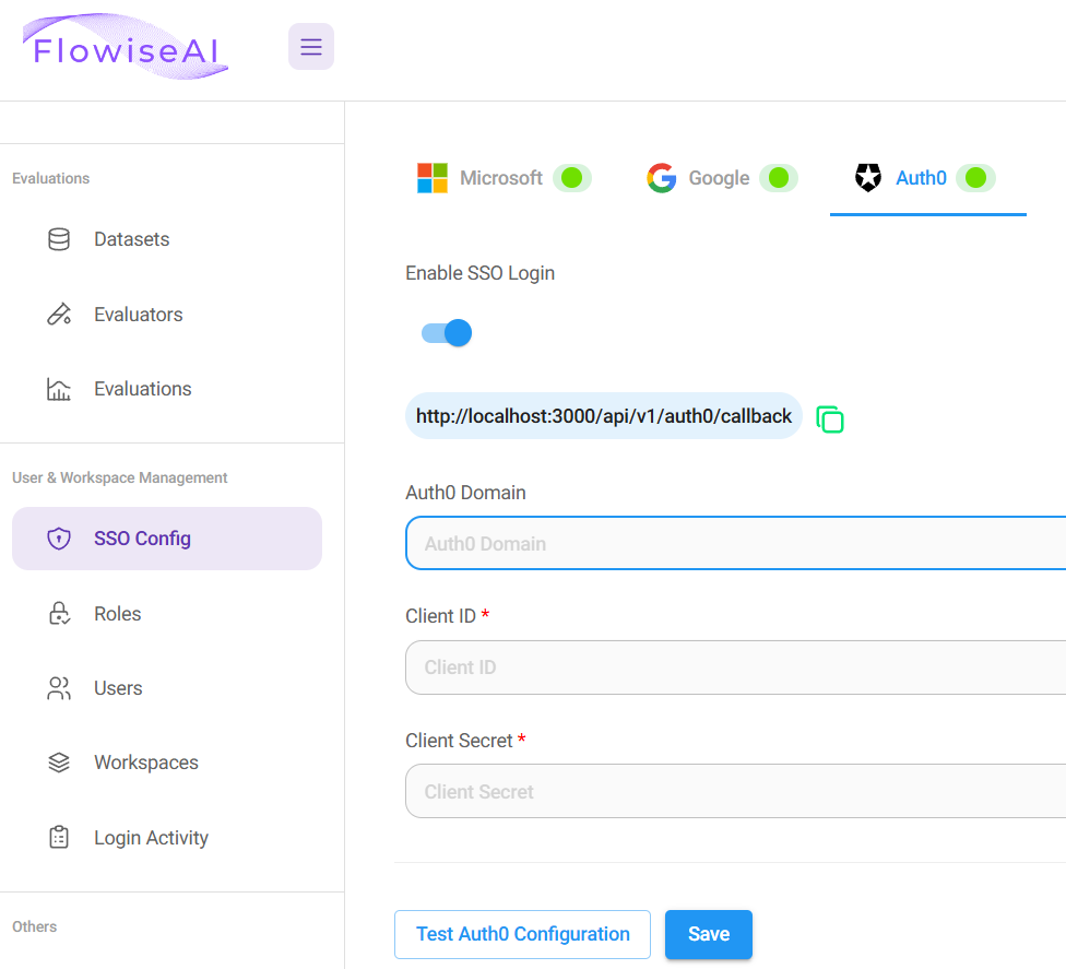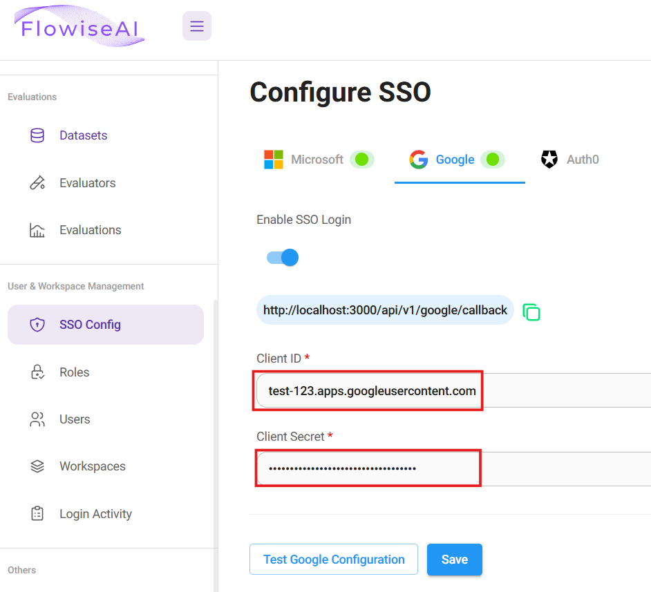 6. De vuelta a la Flowise App, completa el Domain, Client ID y Secret. Test y Save la configuration.