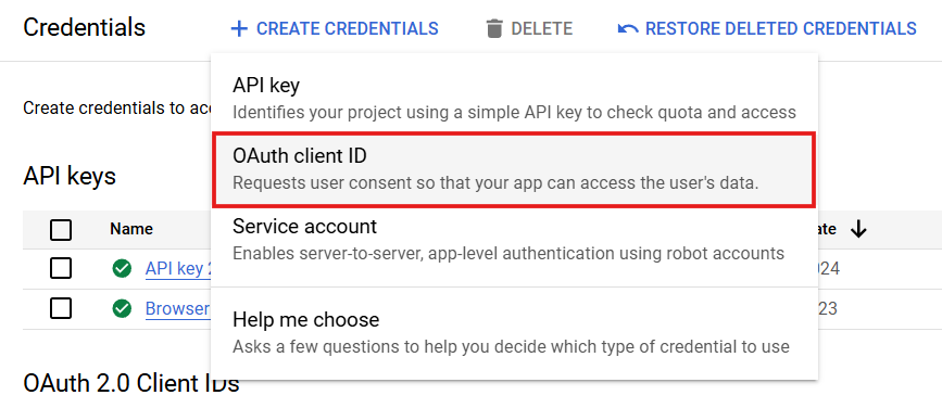 2. Haz click en **Create credentials** > **OAuth client ID**