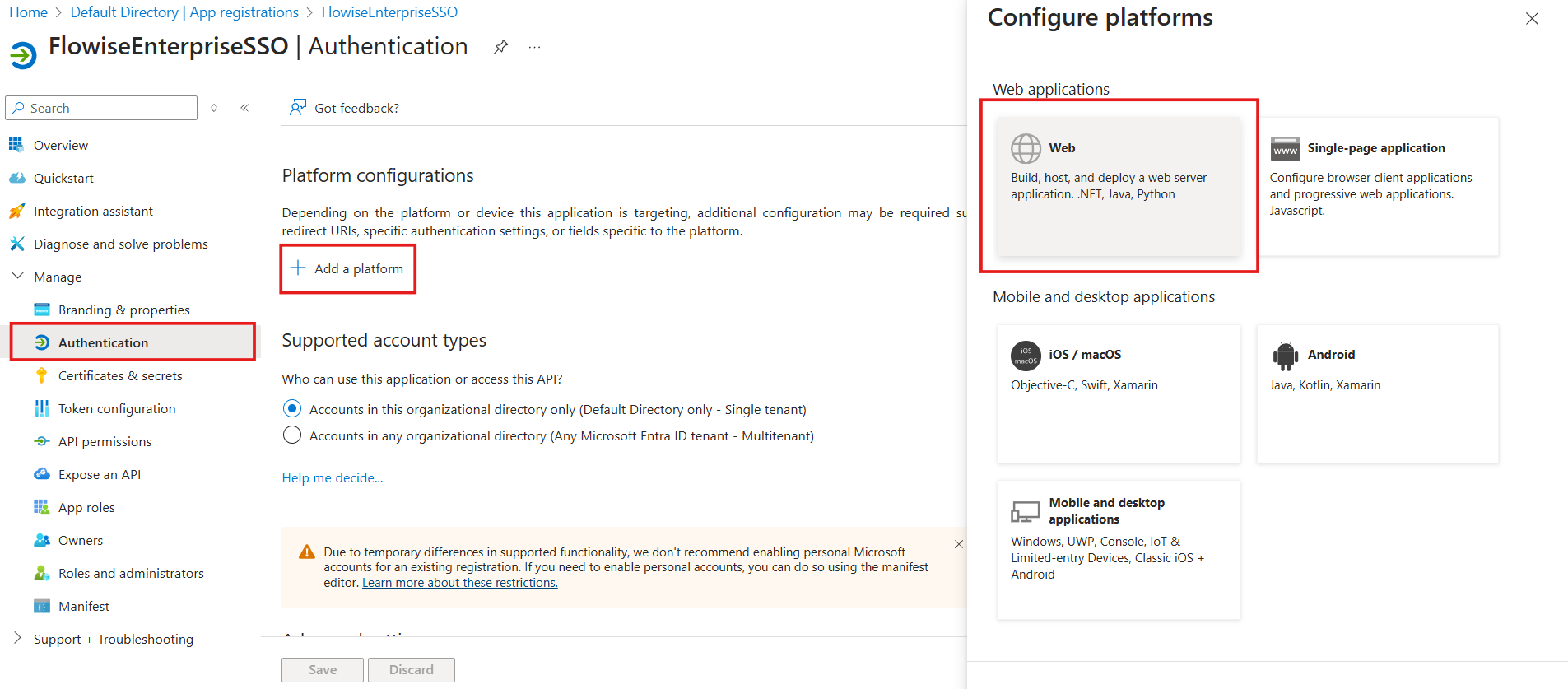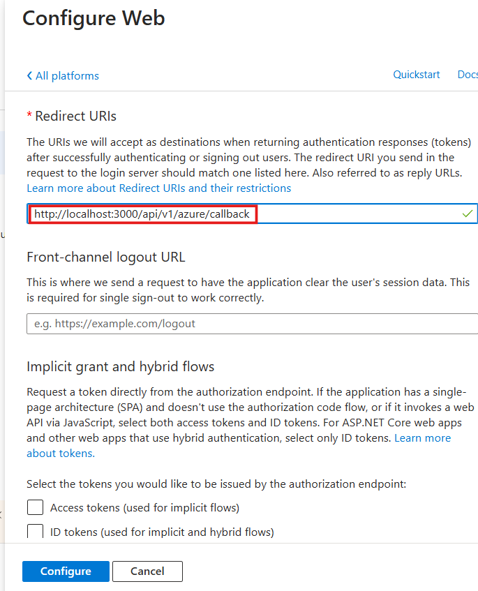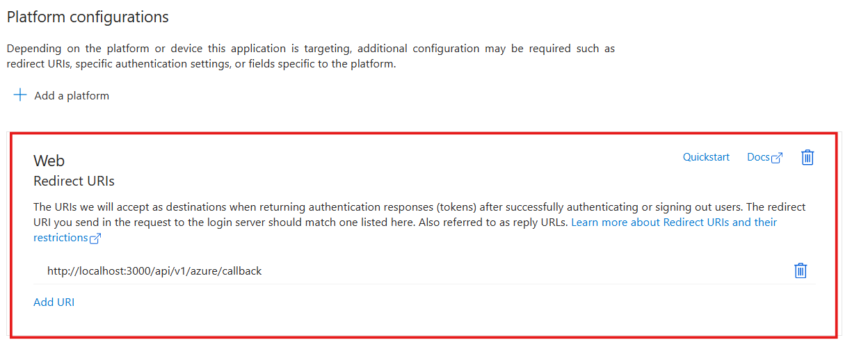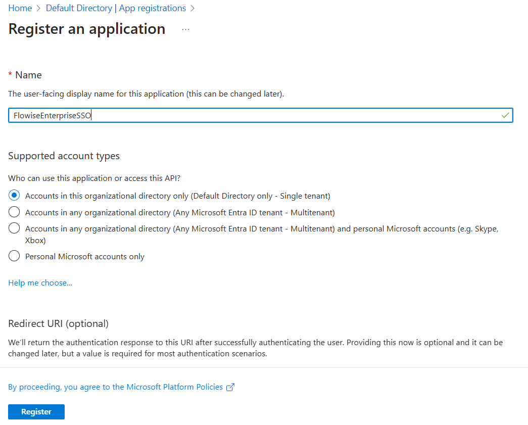 8. Completa los redirect URIs. Esto necesitará ser cambiado dependiendo de cómo estés haciendo hosting: `http[s]://[your-flowise-instance.com]/api/v1/azure/callback`: