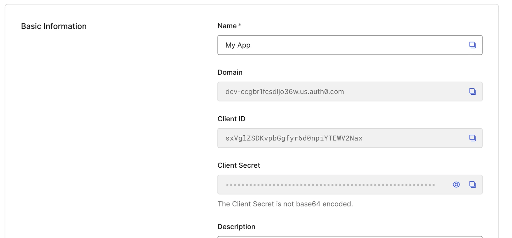 3. Configura los fields como Name, Description. Toma nota del **Domain**, **Client ID**, y **Client Secret**.