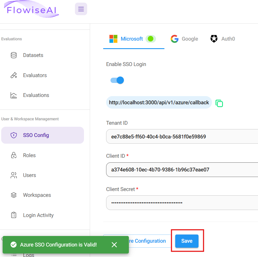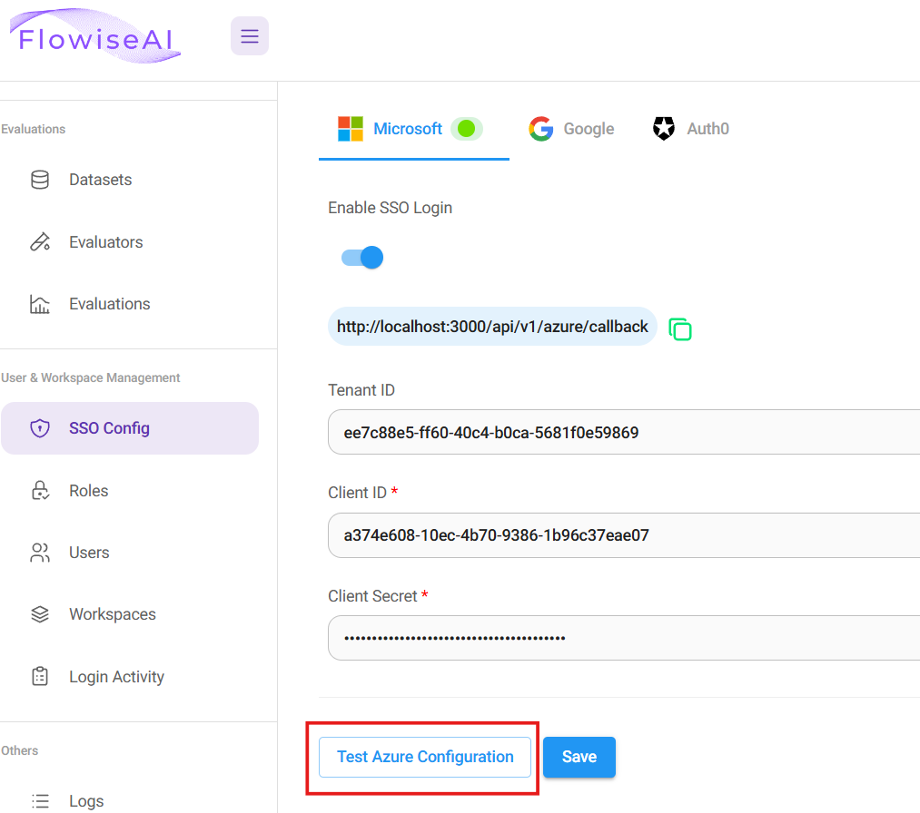 10. De vuelta a la Flowise app, haz login como Organization Admin. Navega a SSO Config desde la left side bar. Completa el Azure Tenant ID y Client ID del Paso 4, y Client Secret del Paso 6. Haz click en Test Configuration para ver si la conexión puede establecerse exitosamente: