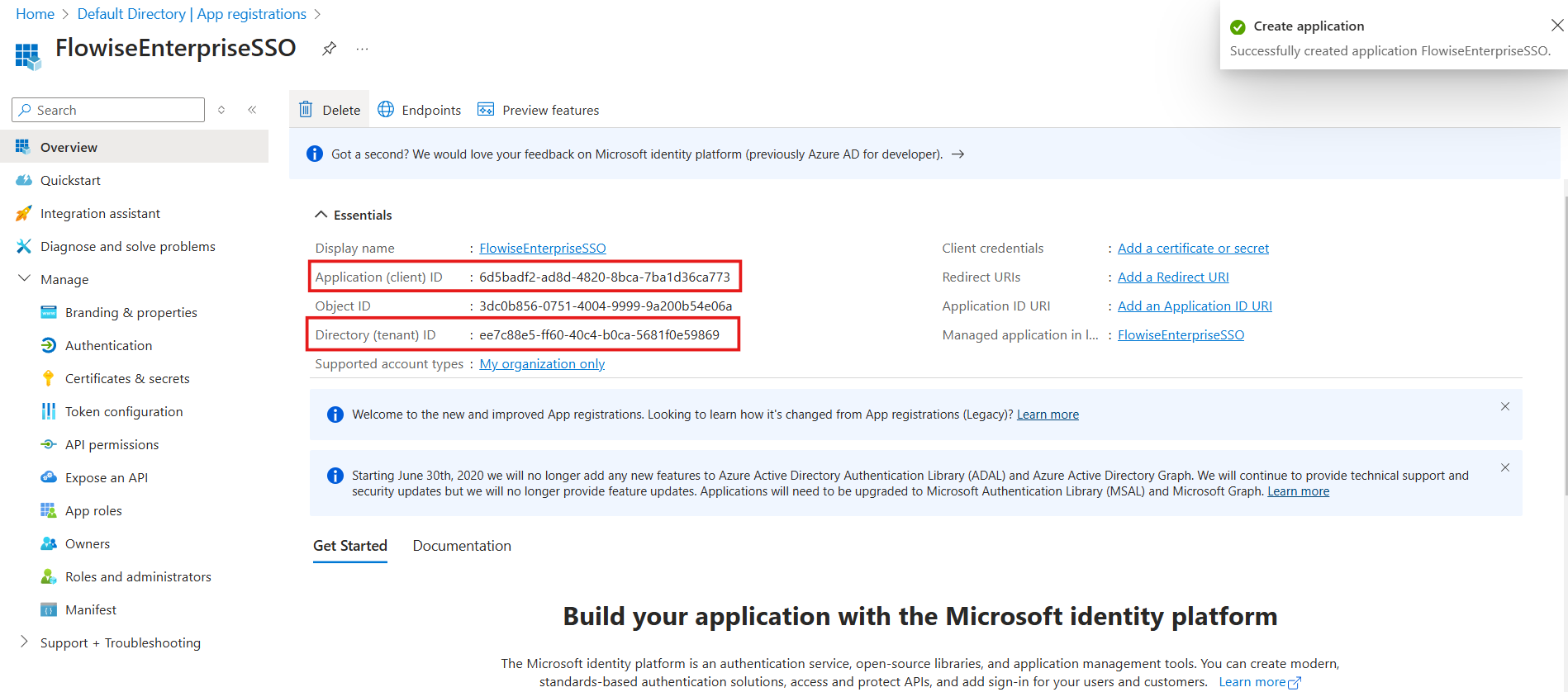 4. Después de que se crea una app, anota el Application (client) ID y Directory (tenant) ID: