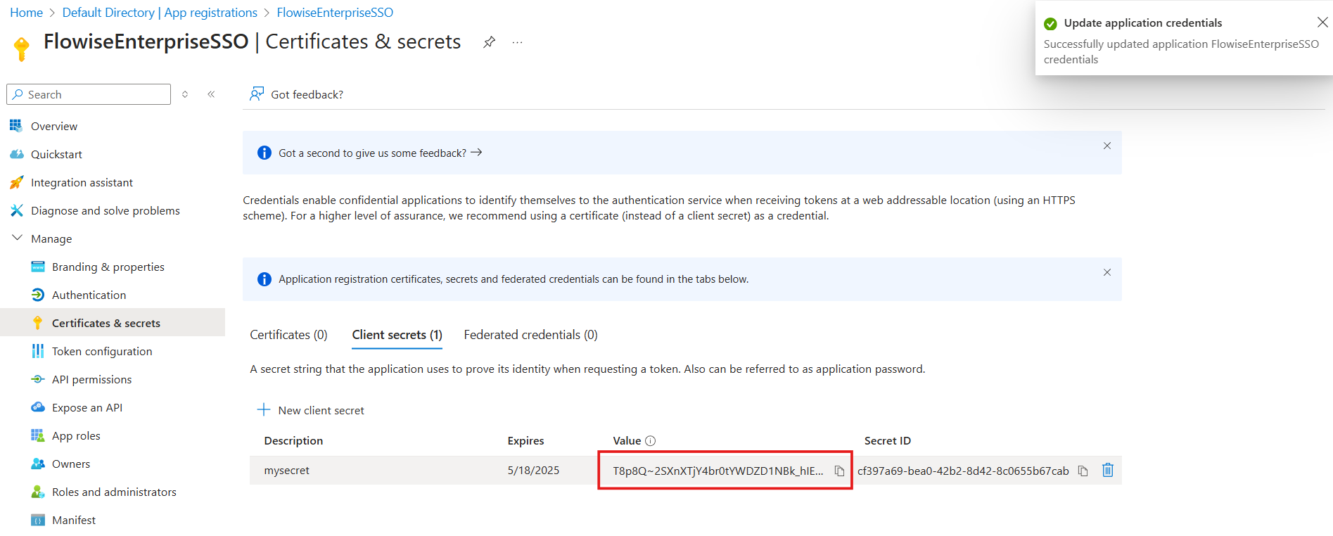 6. Después de que el secret ha sido creado, copia el Value, <mark style="color:red;">no</mark> el Secret ID: