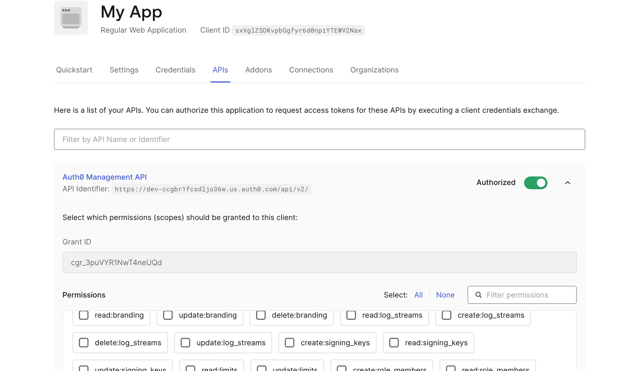 5. En el tab de API's, asegúrate de que Auth0 Management API está enabled con los siguientes permissions