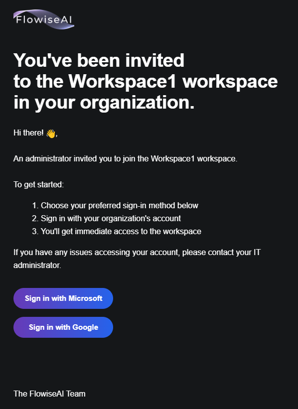 Hacer click en el button llevará al invited user directamente a la pantalla de Flowise SSO login: