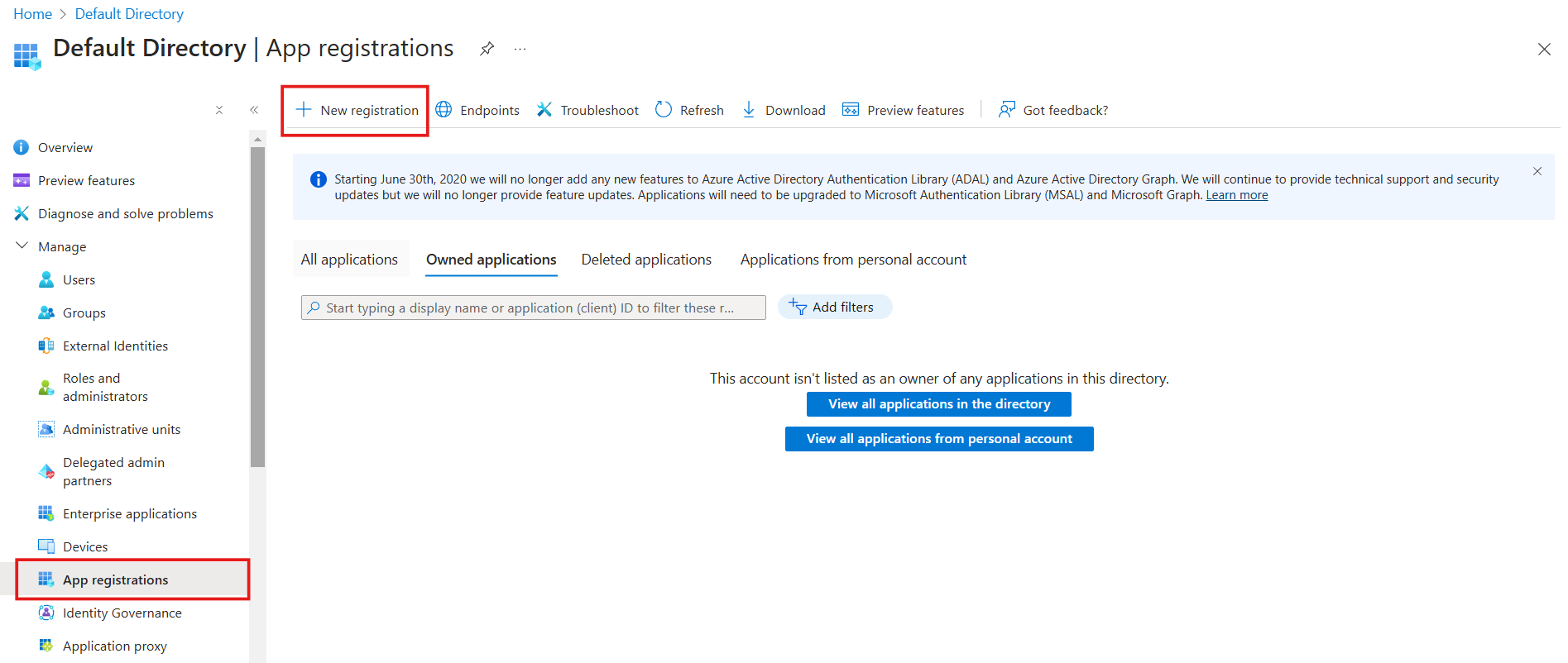 2. Desde la left hand bar, haz click en App Registrations, luego New Registration: