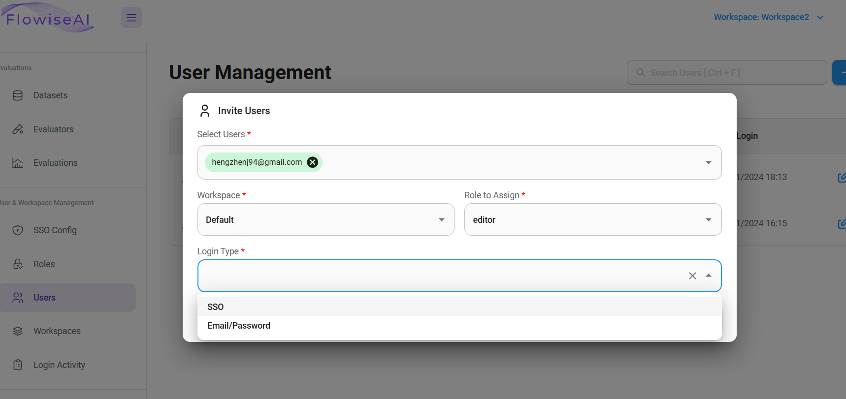 Para que un nuevo user pueda login usando SSO, tenemos que invite new users a la Flowise application. Esto es esencial para mantener un registro del role/workspace del invited user. Consulta la sección [Invite Users](https://github.com/codermtk/FlowiseDocs/blob/espanolflowise/using-flowise/workspaces.md#invite-user) para la configuración de environment variables.