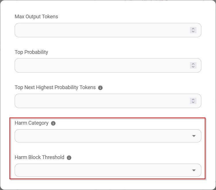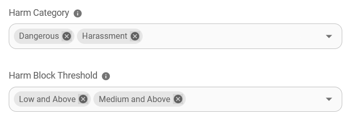 * Al configurar los **Safety Attributes**, la cantidad de selecciones en **Harm Category** y **Harm Block Threshold** debe ser la misma. Si no lo es, se mostrará el error `Harm Category & Harm Block Threshold are not the same length`