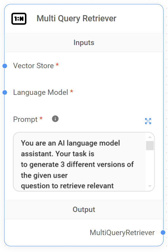 <figure><img src="https://769538227-files.gitbook.io/~/files/v0/b/gitbook-x-prod.appspot.com/o/spaces%2FjyGndXAZESKnWvU2qnmw%2Fuploads%2Fgit-blob-39de29bf61b68d573cc5b7d791130875c1cc59c2%2Fup-006.png?alt=media" alt="" width="283"><figcaption><p>Nodo Multi Query Retriever</p></figcaption></figure>
