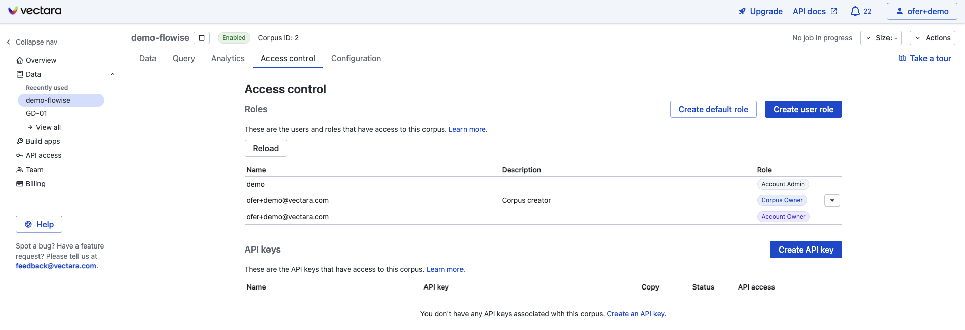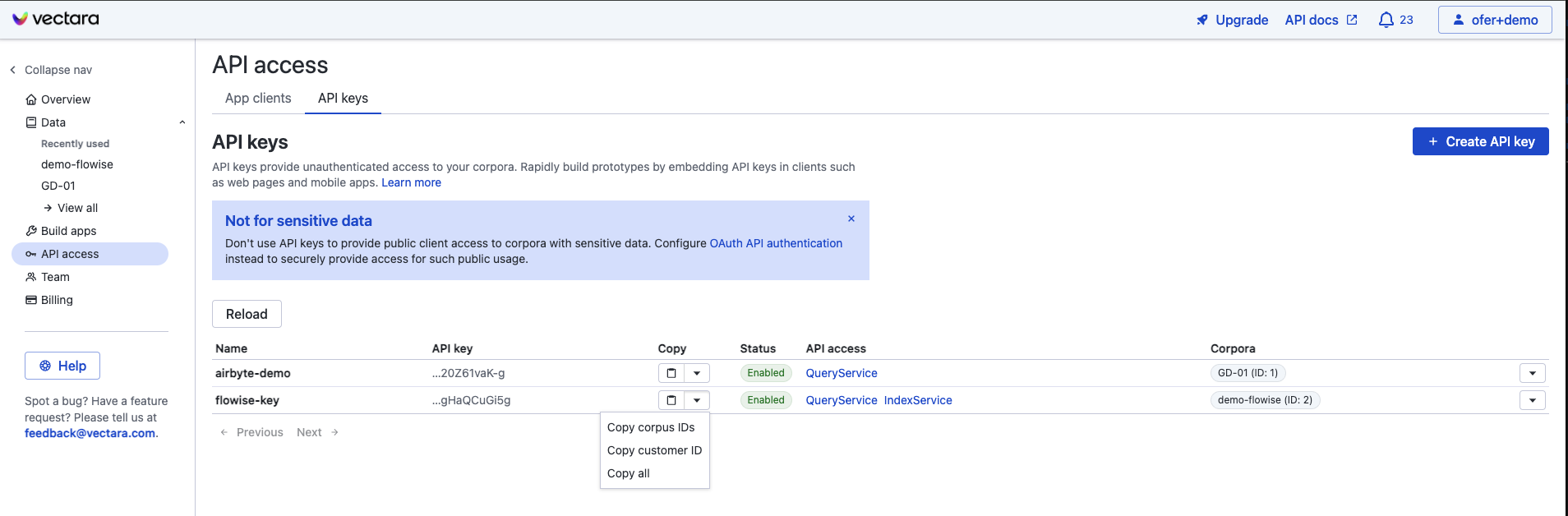 4. Obtén tu **Corpus ID, API Key, y Customer ID** haciendo clic en la flecha hacia abajo bajo "copy" para tu nueva API key: