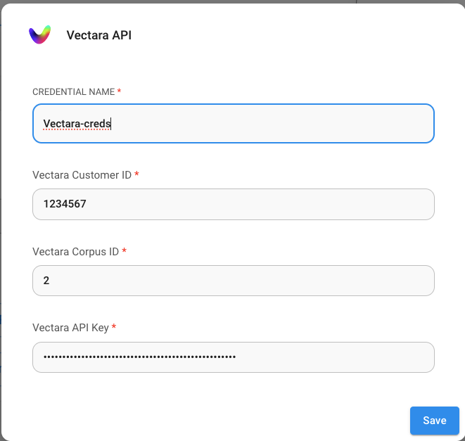 5. De vuelta al canvas de Flowise, crea tu chatflow. Haz clic en **Create New** desde el menú desplegable de Credentials e ingresa tus credenciales de Vectara.
