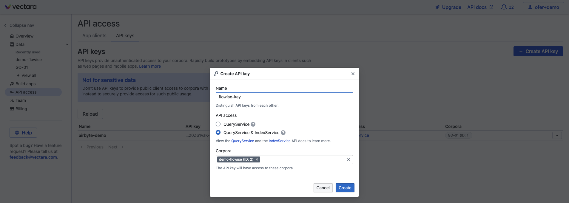 2. Haz clic en el botón **"Create API Key"**, elige un nombre para la API key y selecciona la opción **QueryService & IndexService**