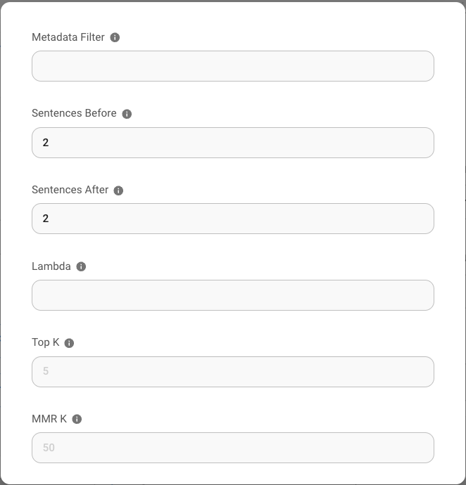 * "Sentences before" y "Sentences after": estos controlan cuántas oraciones antes/después del texto coincidente son devueltas como resultados del motor de recuperación de Vectara